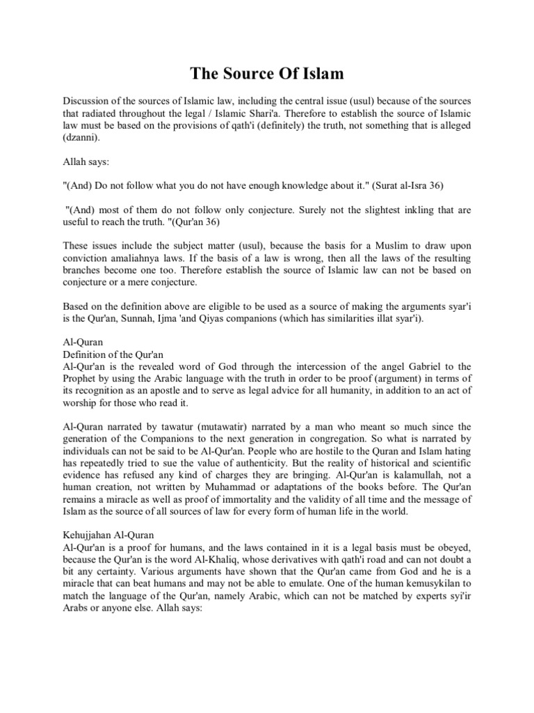 Qiyas is also one of the secondary sources. The fourth source of islamic law is qiyas which, literally, means judging or comparing with a thing. qiyas means essentially to use human reasoning to compare an existing situation with one for which legislation already exists. Islamic law (fiqh), for its part, is the means by which we are capable of producing appropriate rulings linguistically speaking, the word shari'a has two meanings. Sources of islamic law various sources of islamic islamic law are used by islamic islamic jurisprud jurisprudence ence to elucidate elucidate the sharia qiyas must not be based on arbitrary jud!ment, but rather be firmly rooted in the primary sources. The sources of islamic law (shari'ah) comprise of (1) the qur'an (2) sunnah (prophetic tradition) (3) ijma' (consensus of opinion) (4) qiyas (analogical deduction (5) istihsan (equity in some even go as far as saying that it is the sole source of islamic law, that all other sources are explanatory to it.